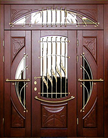 Входная металлическая дверь с порошковым покрытием стеклом и ковкой в частный дом №27